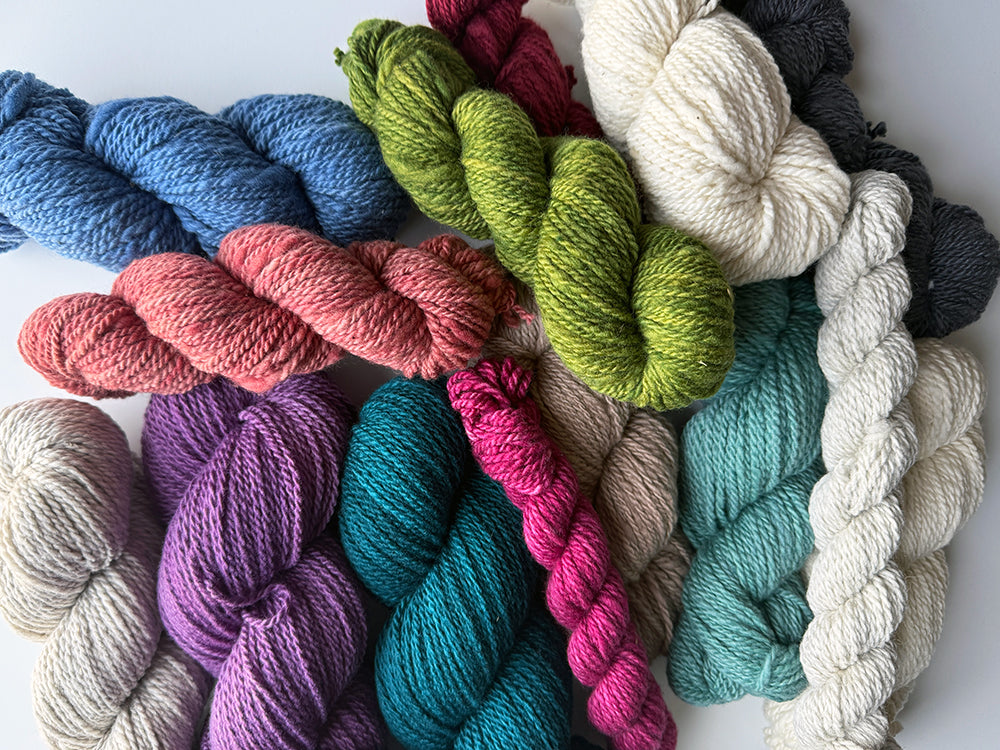 Grab a 2lb mystery fiber bag in your choice of fingering & sport or DK & worsted weights. Each bag is a wild mix of our High Country Wool bases, featuring one-pot skeins, thick-to-thin yarn, a few quirky misfits (slubs & dye inconsistencies), and colors from across our entire palette. Perfect for knitting, crocheting, weaving, embroidery, skein sizes range from 10 to 100+ grams, with mostly of medium to large sizes for endless project possibilities! Individual skeins are not labeled.